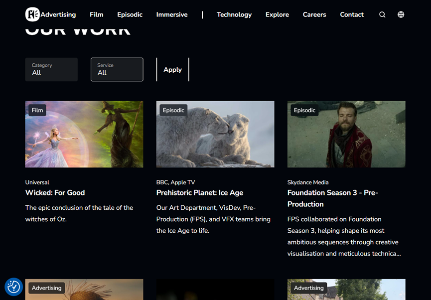 This blog post will focus on Framestore, a London-based VFX company. Framestore’s main production areas include film, advertising, and games. In my understanding, VFX largely involves CGI and 3D animation, and based on my research, VFX jobs are divided into three phases: pre-production, mid-production, and post-production. Pre-production roles include concept design, scene design, and character design. Mid-production focuses more on animation, modeling, and special effects. Post-production is more about finishing touches, such as rendering, compositing, and final output. In my opinion, VFX is a technology that brings virtual ideas and unrealistic visions to life, and it’s a very important part of the film and television industry today.